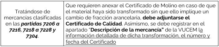 c) Certificado de Molino, de conformidad con lo establecido en la regla 2.2.19, (no mayor a 6 meses)